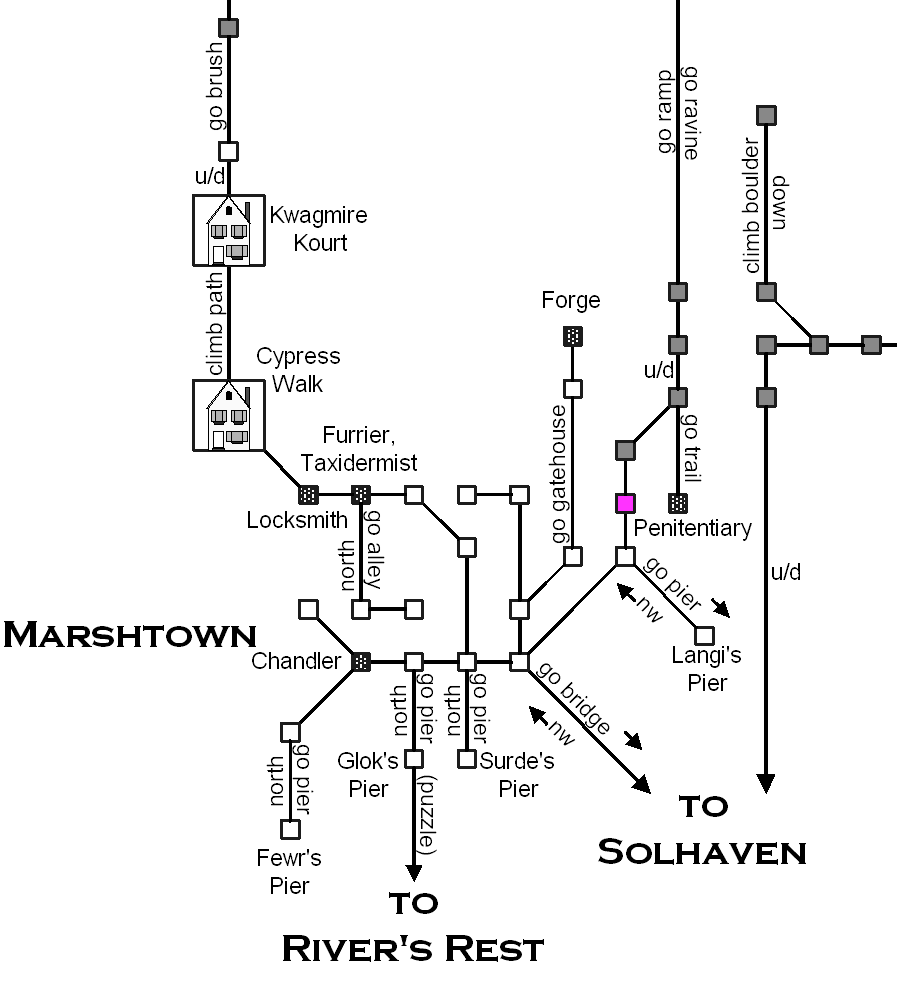 | Modified Tsoran schematic map. Dark grey rooms are outside the justice system. The fuchsia room is a potential candidate: Marshtown, Land's End. |