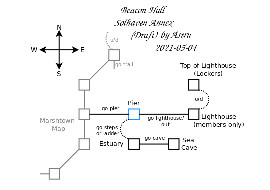 The below layout is simply a tentative draft which has not been voted on. Specific layouts and rooms are subject to discussion and modification after pre-approval of this general theme. We are seeking pre-approval of a lighthouse on a pier by an estuary in Marshtown. Keep in mind it is easier to discard the idea of, e.g., a sea cave after approval, than add one later which might not be approved.